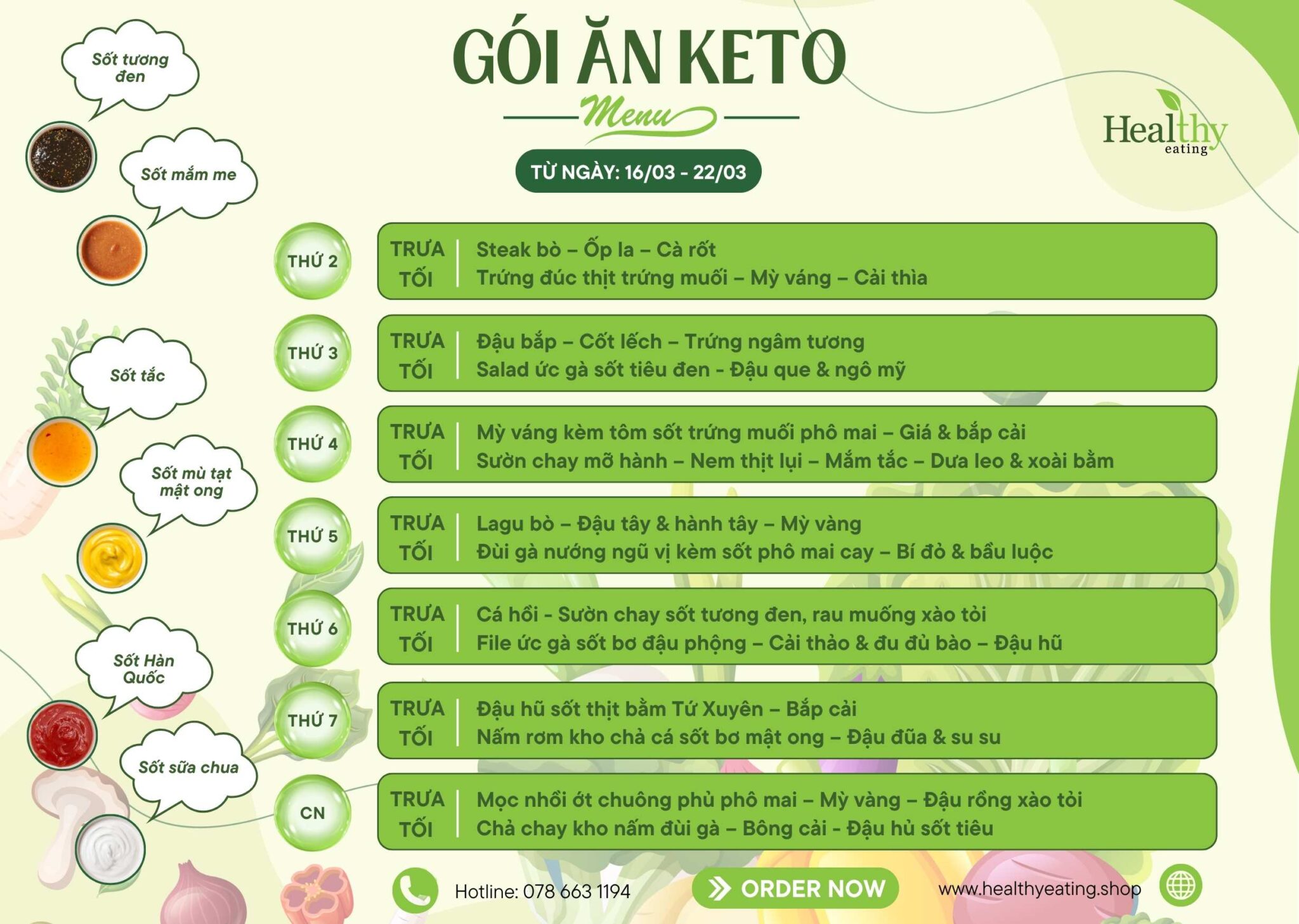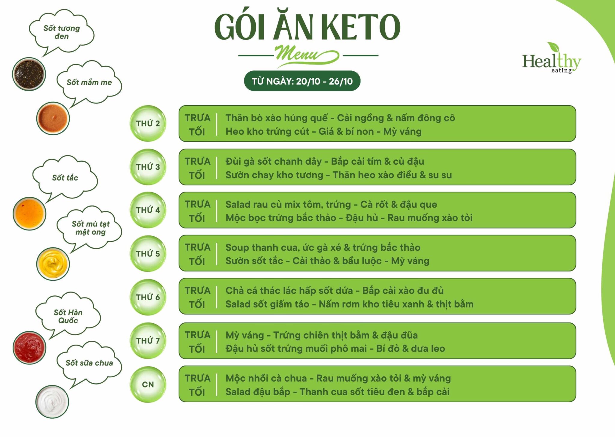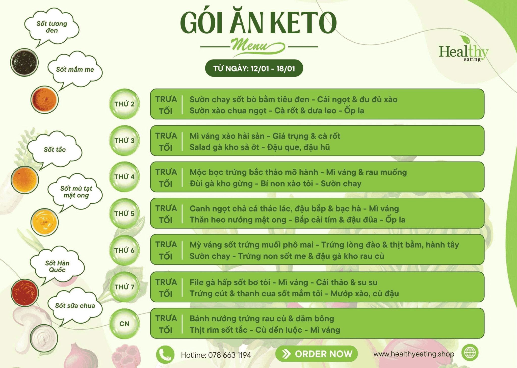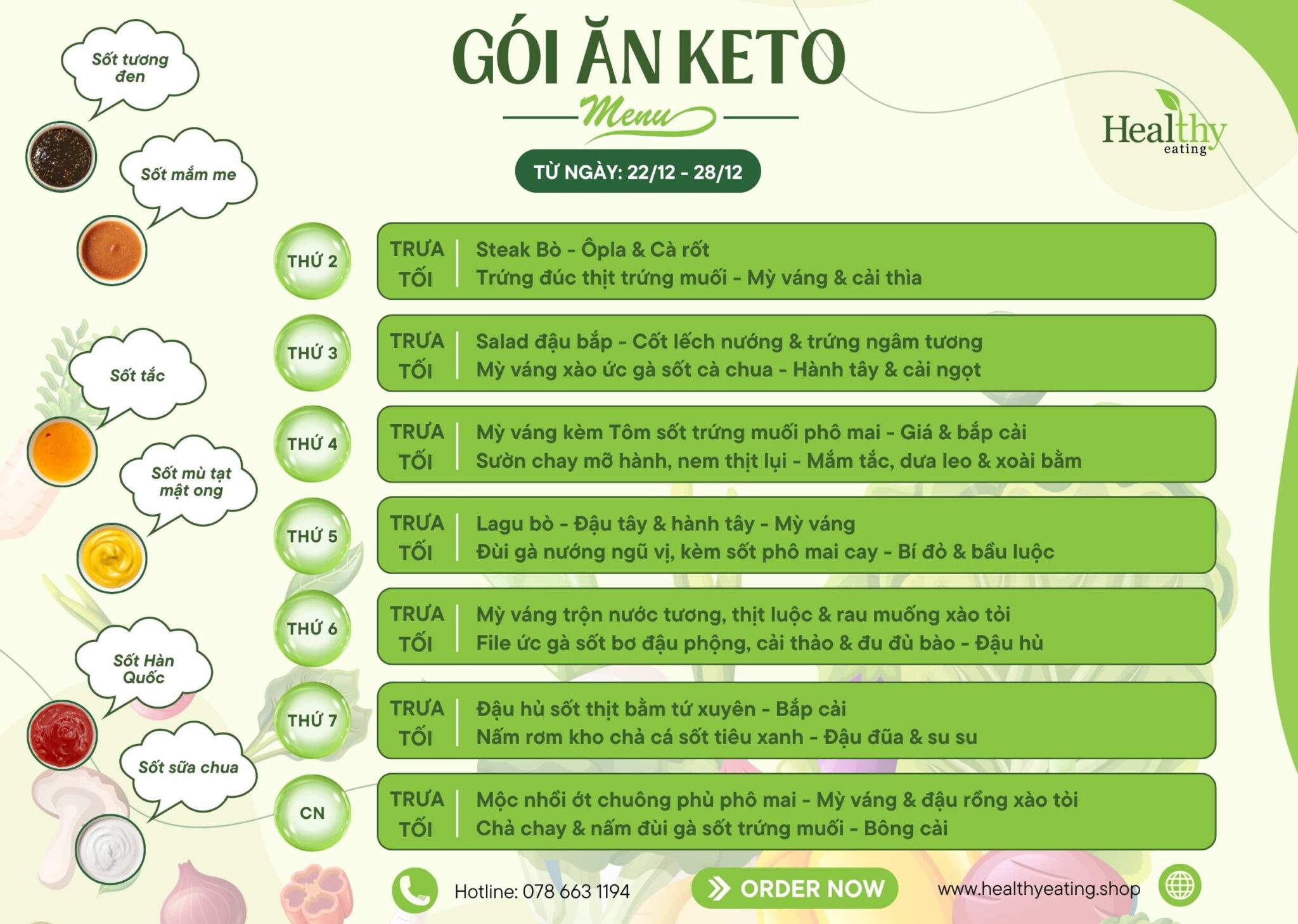 Mấu chốt là bạn phải kiên trì thực hiện và có lòng tin. Người khác đều đã giảm cân được, chỉ còn bạn thôi đấy! - Gói ăn tuần giảm cân Keto 7 ngày mỗi ngày 2 bữa ăn - Không chứa tinh bột - Ship gói ăn tận nhà từ thứ 2 đến chủ nhật - Calories dao động từ 1000 - 1200 mỗi ngày - Ít đường, rau củ xa